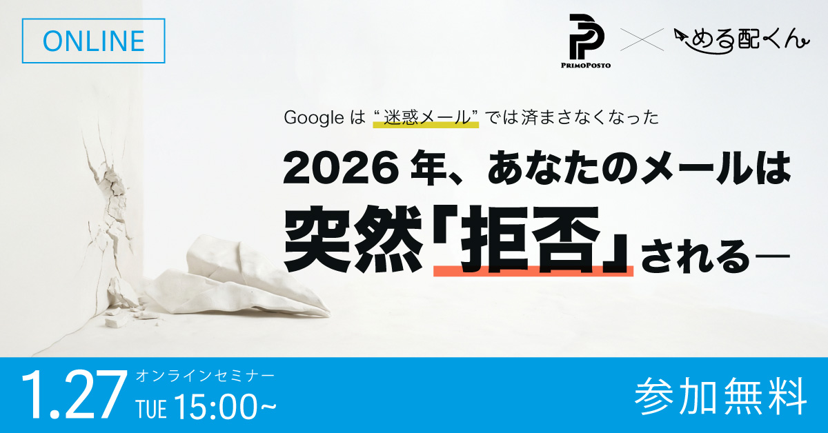 いつも「める配くん」をご利用いただき、誠にありがとうございます。 メールを配信されている皆様へ、最新の配信事情に関するセミナーのご案内です。 2025年11月上旬、Googleは送信者ガイドラインのFAQを更新しました。… 続きを読む 【2026/1/27開催】 メール配信に関する大切なセミナーのご案内