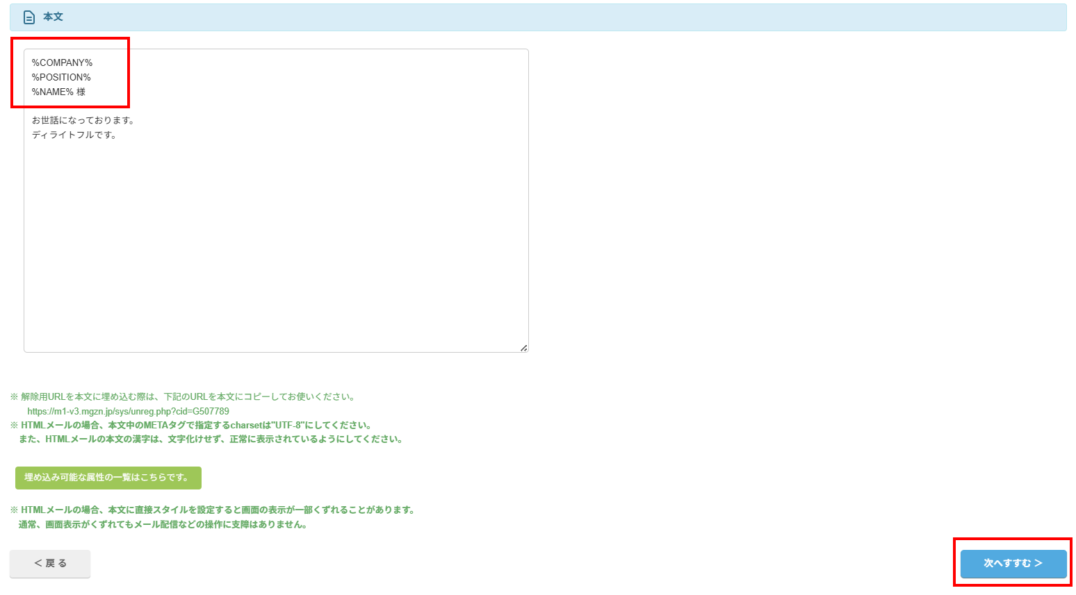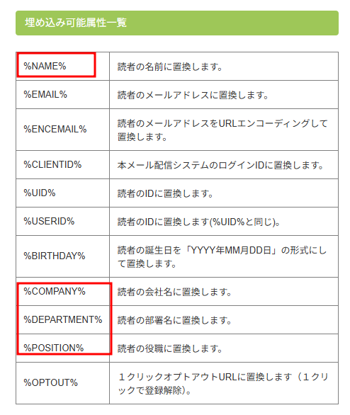 メール本文に読者の名前や会社名を差し込んで配信することができます。