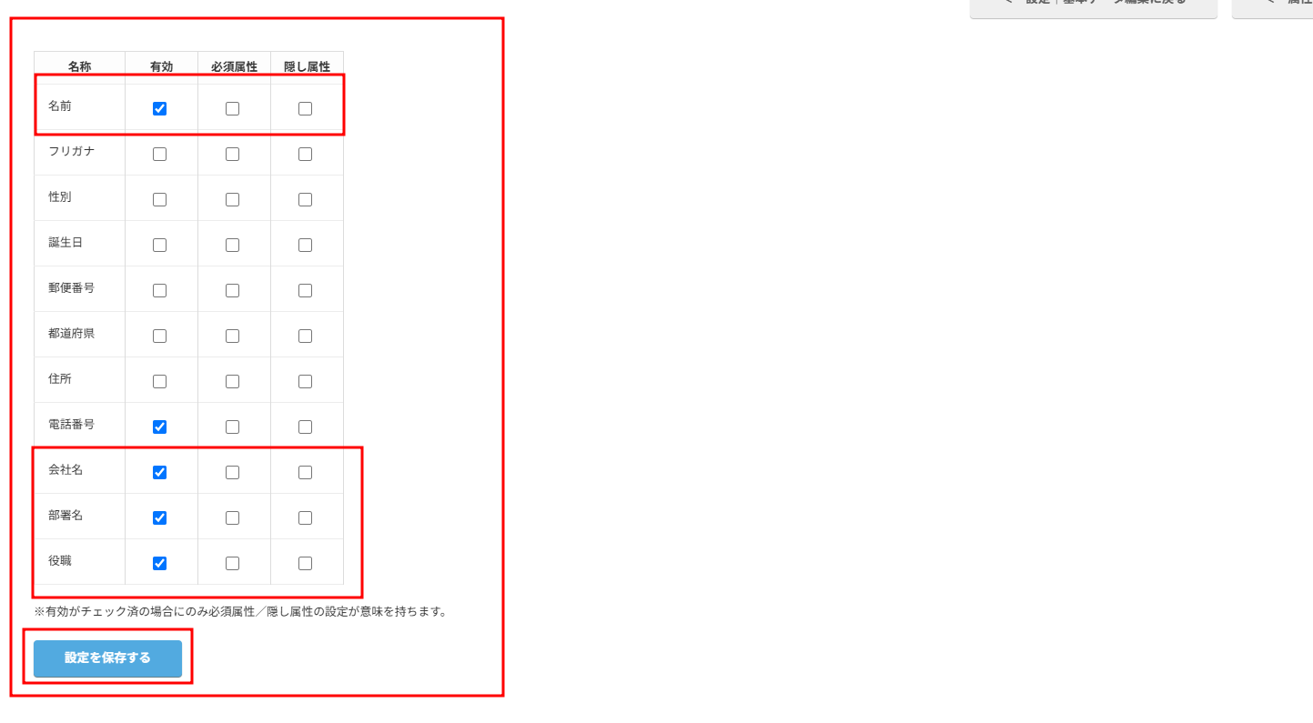 5、「基礎属性一覧・編集」をクリックし、必要な情報と差し込みたい項目にチェックを入れ「設定を保存する」をクリックします。