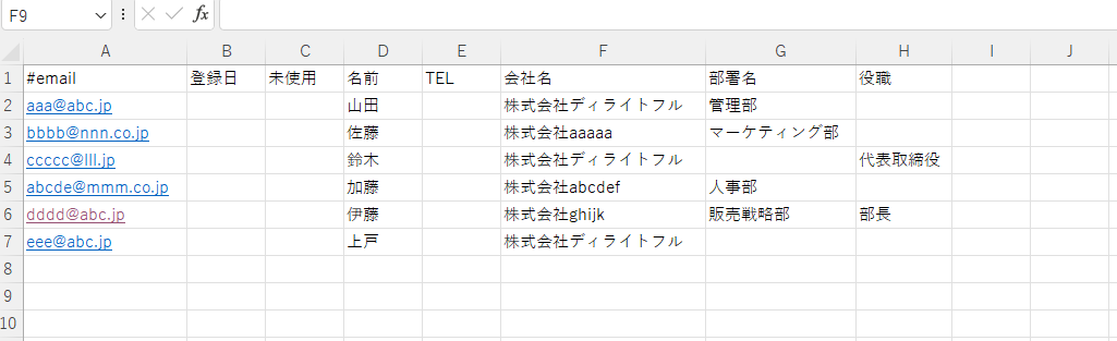 ※B列 登録日 と C列 未使用 は、空欄のままで大丈夫です。