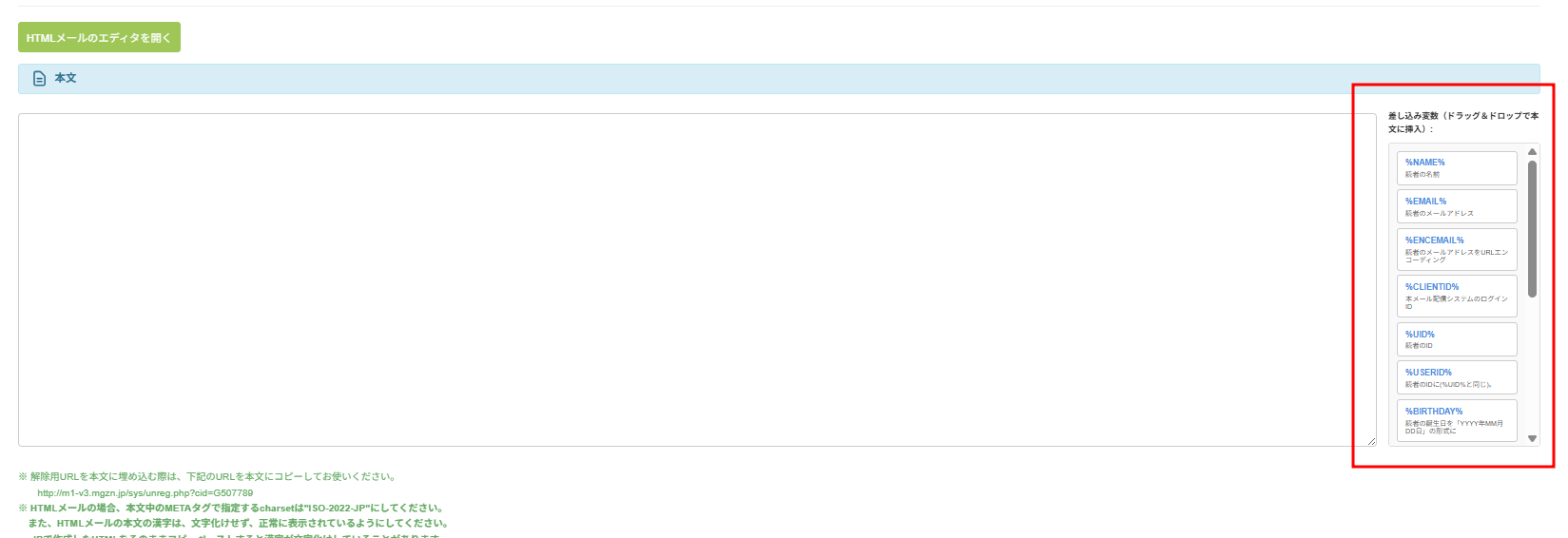 3、本文作成の右側に「差し込みコード」があるので、差し込みたいコードをドラッグ&ドロップします。