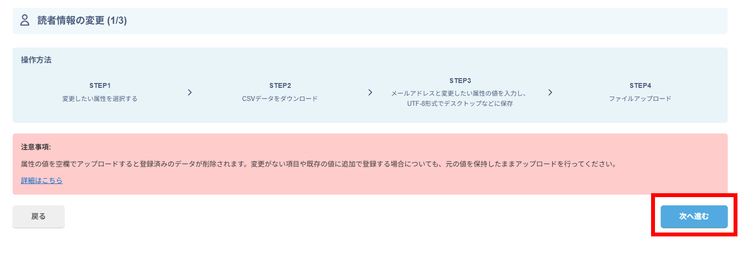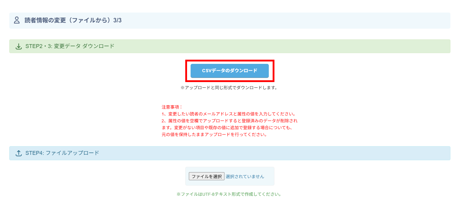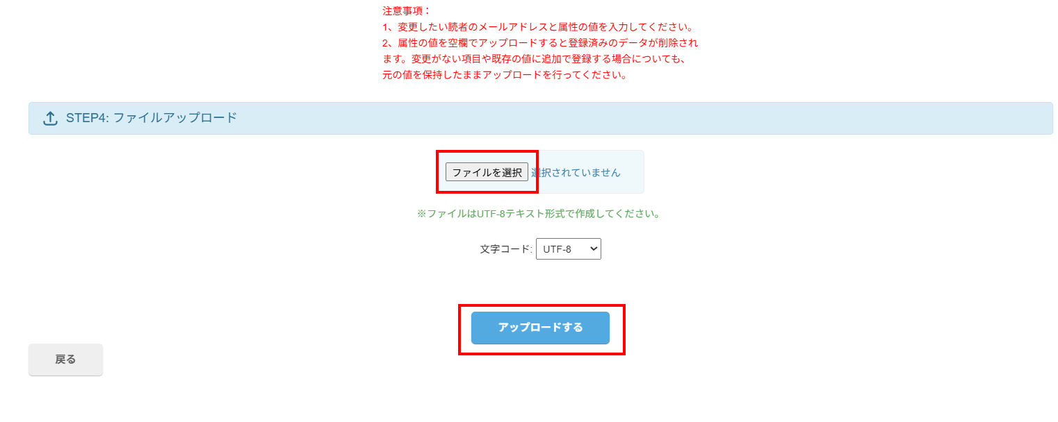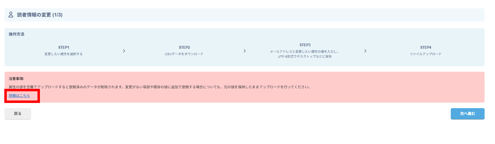 2、属性の値を空欄でアップロードすると登録済みのデータが削除されます。変更がない場合や既存の内容に追加で登録する場合についても、元の値を保持したままアップロードを行ってください。