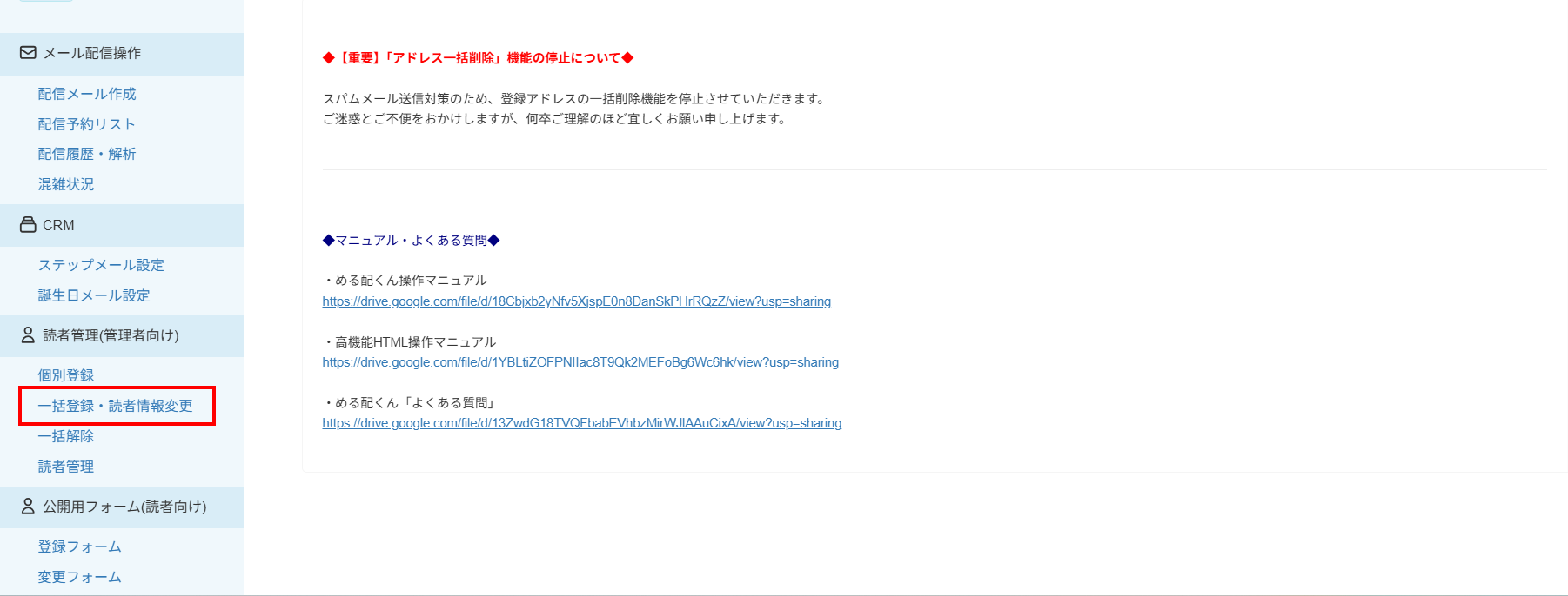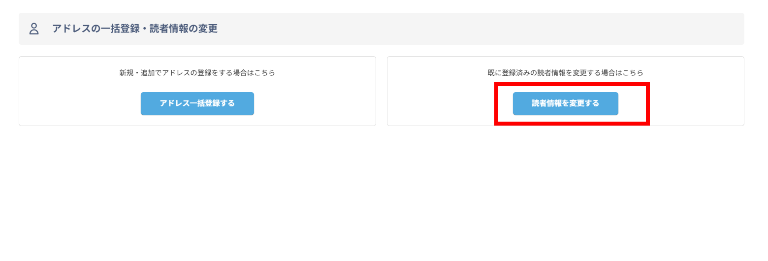 1、画面左の「一括登録・読者情報変更」をクリックします。
