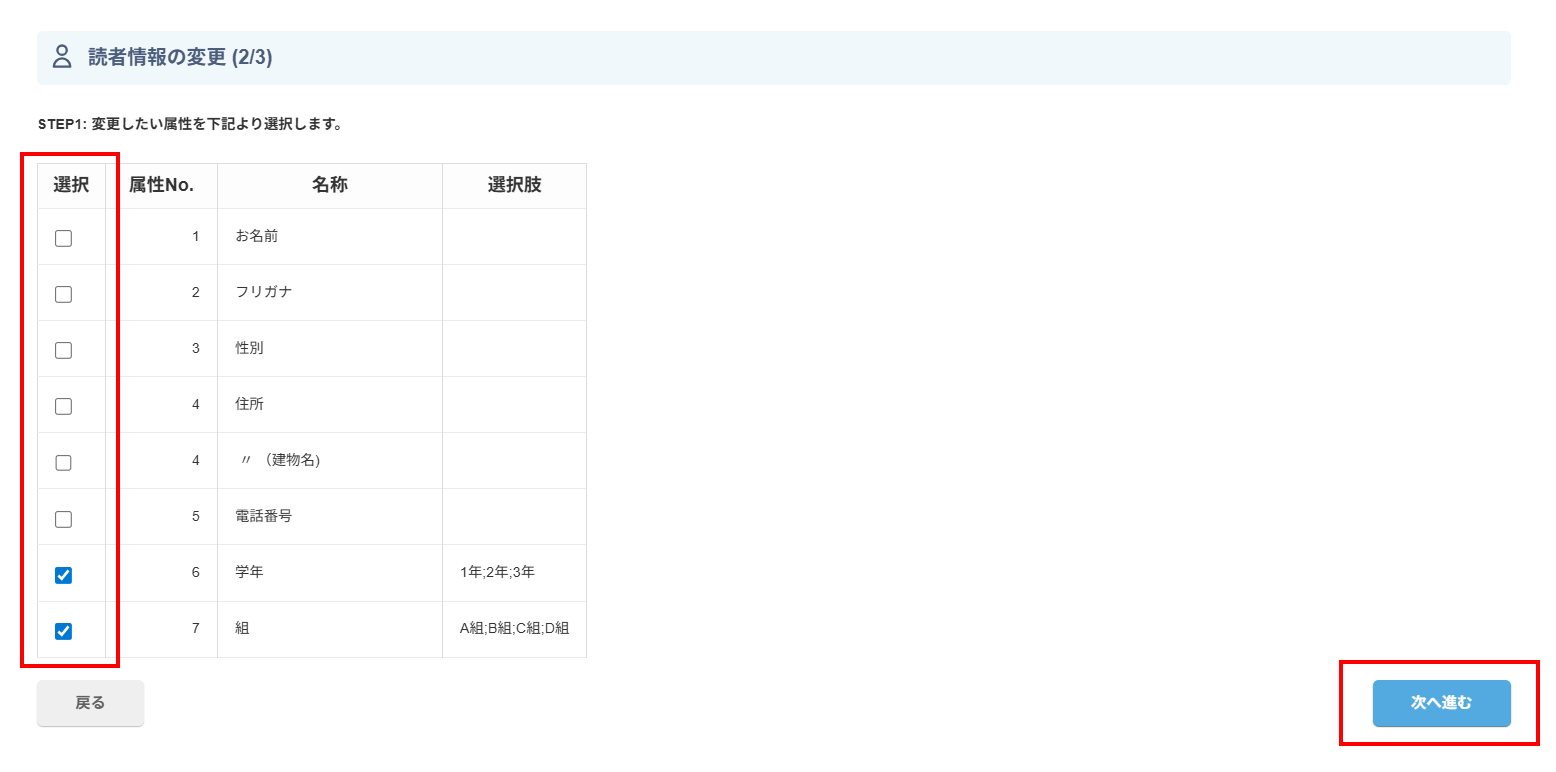 例)メールアドレス・名前・フリガナ・性別・住所・電話番号・学年・クラスという属性の中から学年・クラスという属性だけを選択して変更ができます。