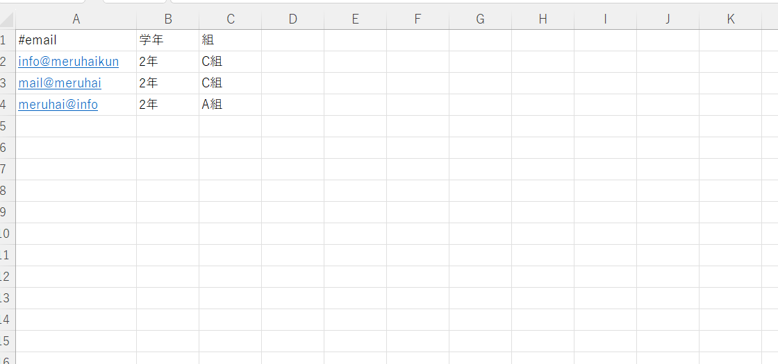 1、CSVは空の状態でダウンロードされるので、変更したいメールアドレスと属性の値を入力してください。