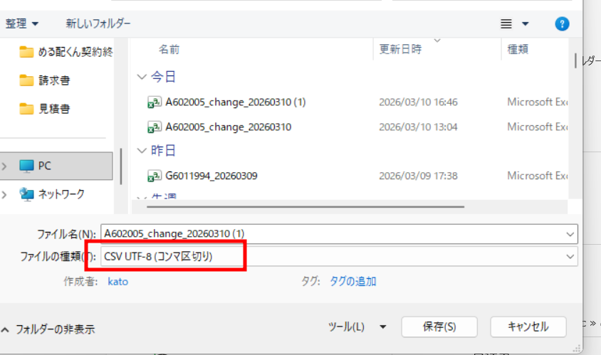 8、入力が完了したら、「CSV UTF-8(コンマ区切り)」でデスクトップなどに保存します。