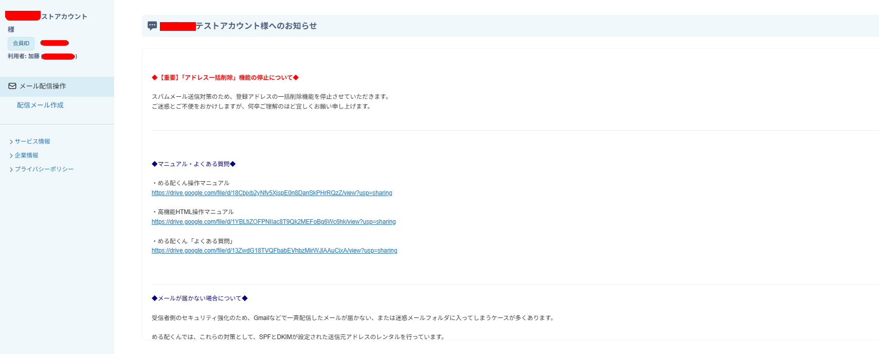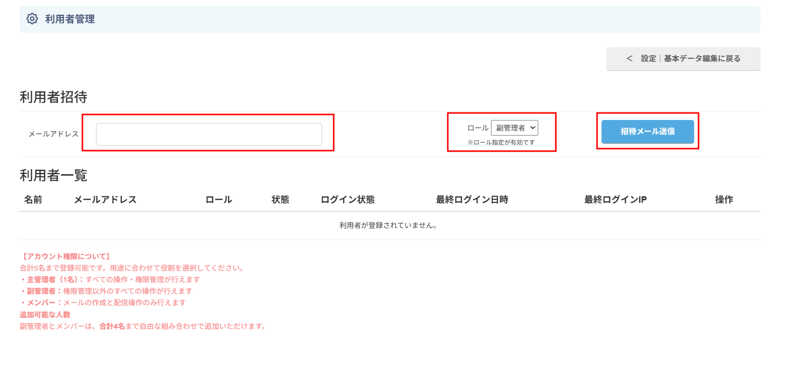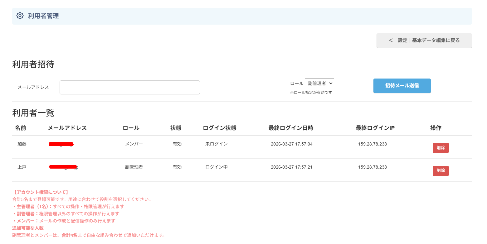 | メンバー | メールの作成と配信操作のみ行えます。 |