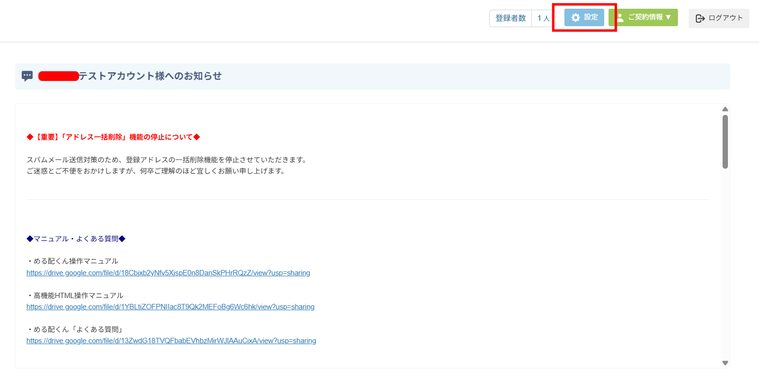 1、ログイン後、画面右上の「設定」ボタンをクリックします。
