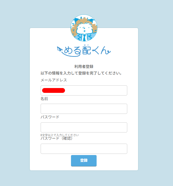 1、招待メールが「める配くん 利用者登録のご案内」という件名で届くので、メールアドレス・名前・仮パスワードを入れます。