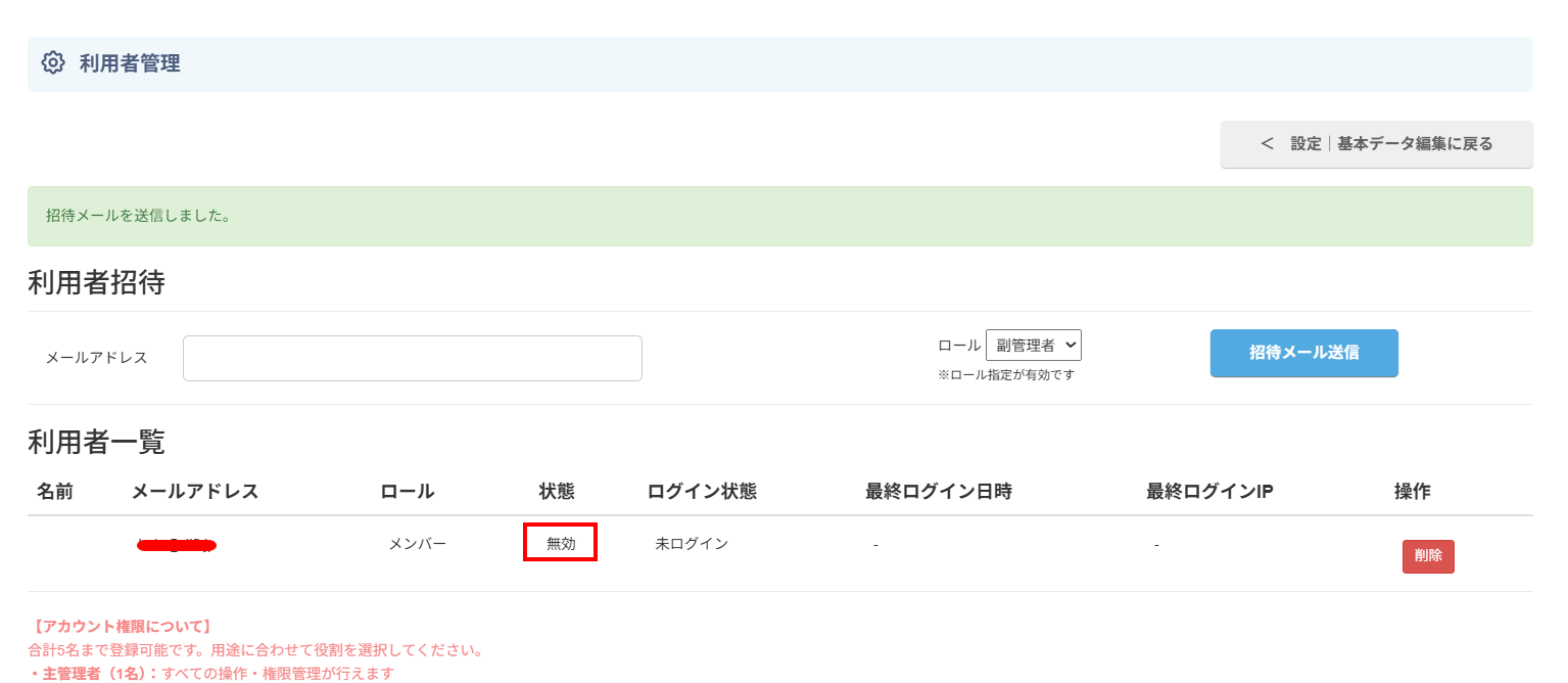 4、招待された方が、ログインの手続きをすると「無効」が「有効」に切り替わります。