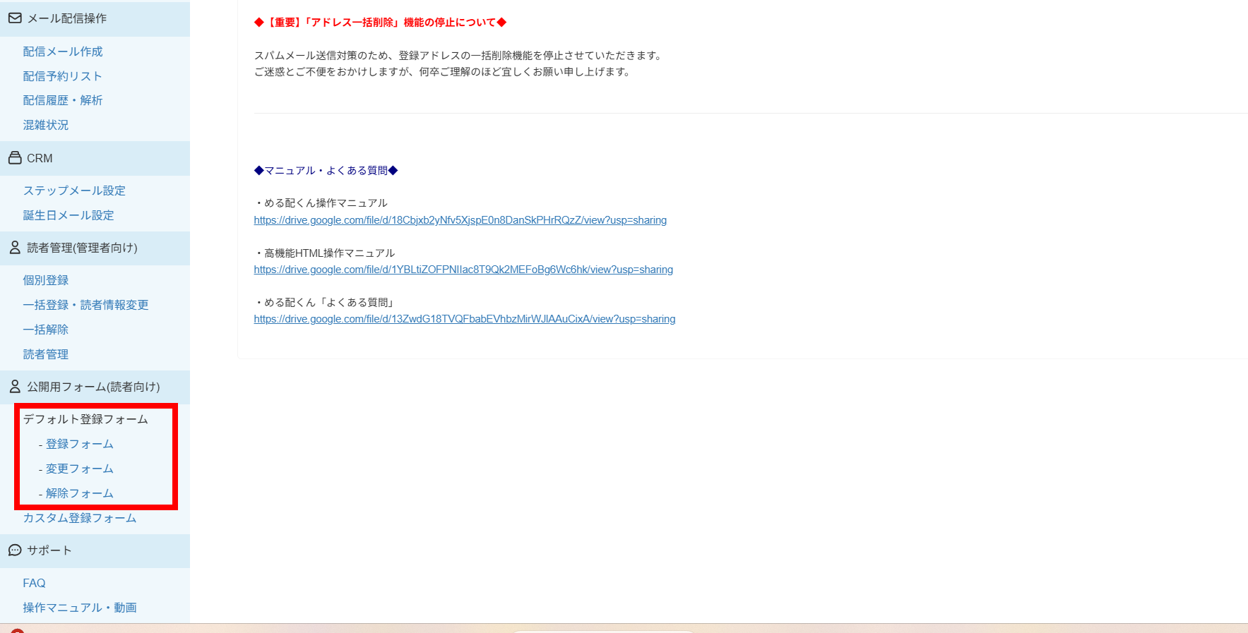 ログイン後、画面左下に表示される「登録フォーム」「変更フォーム」「解除フォーム」が、デフォルトのフォームとなります。フォームが一つで事足りる場合は、こちらをそのままご利用ください。