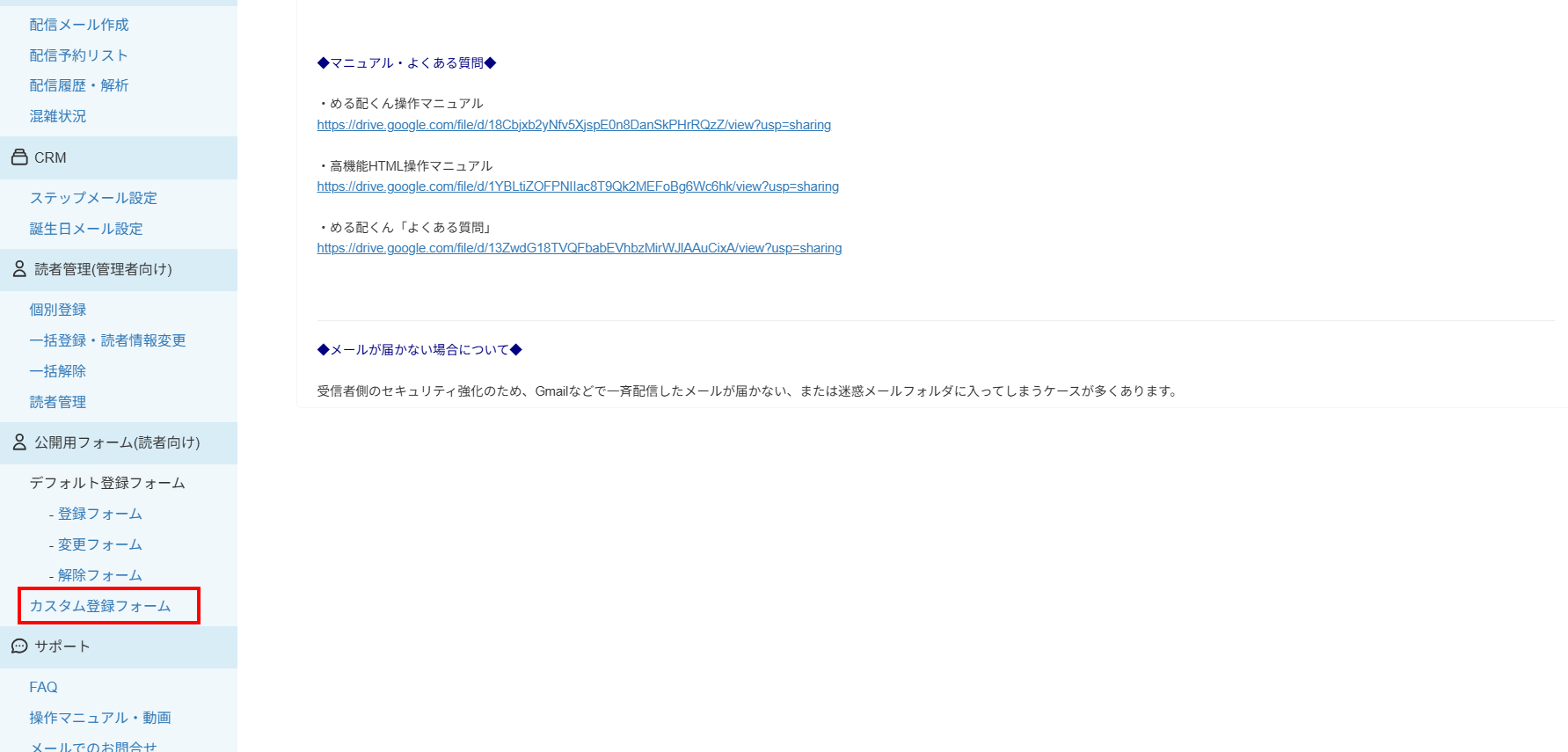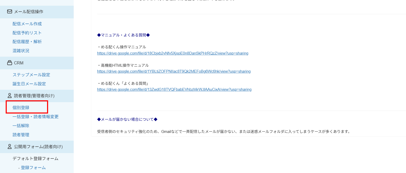 管理者が読者のデータを1件1件登録する場合の「個別登録」は、デフォルトの登録フォームと紐づいております。