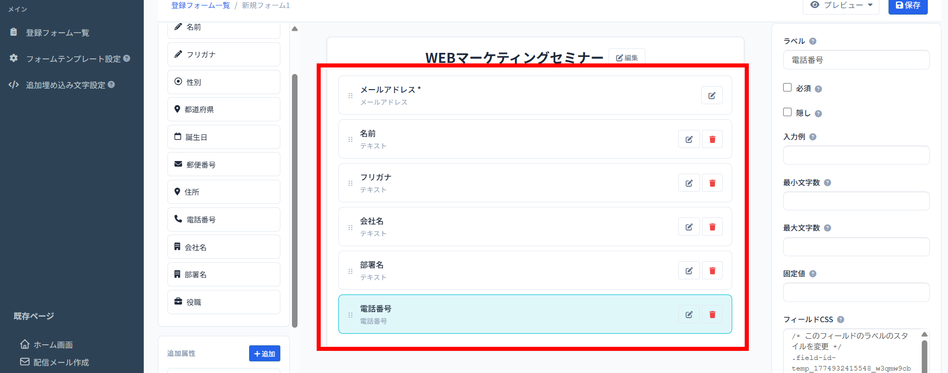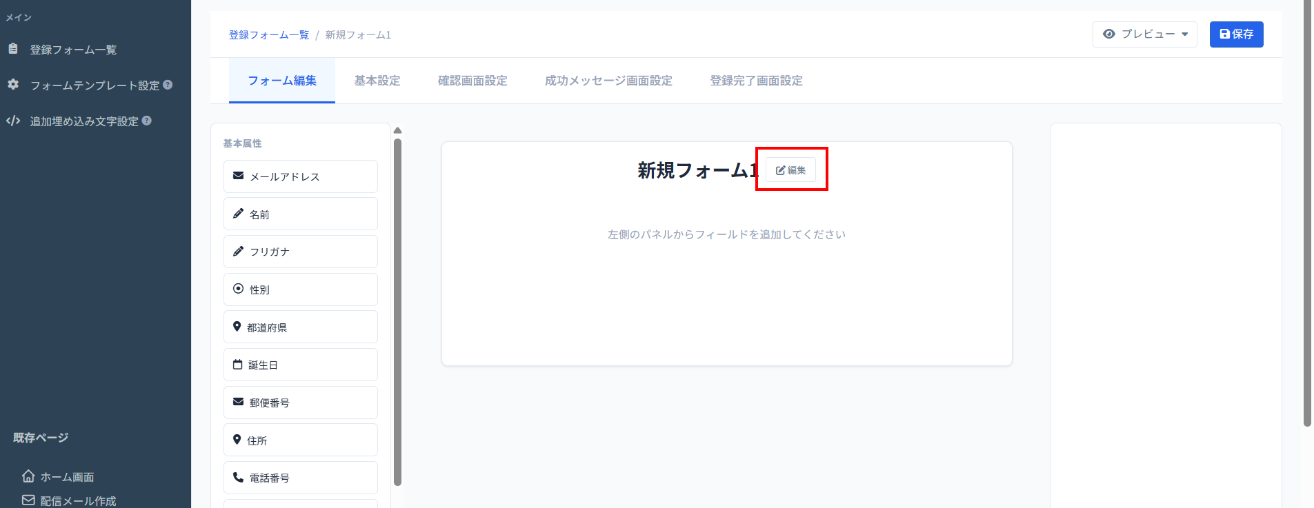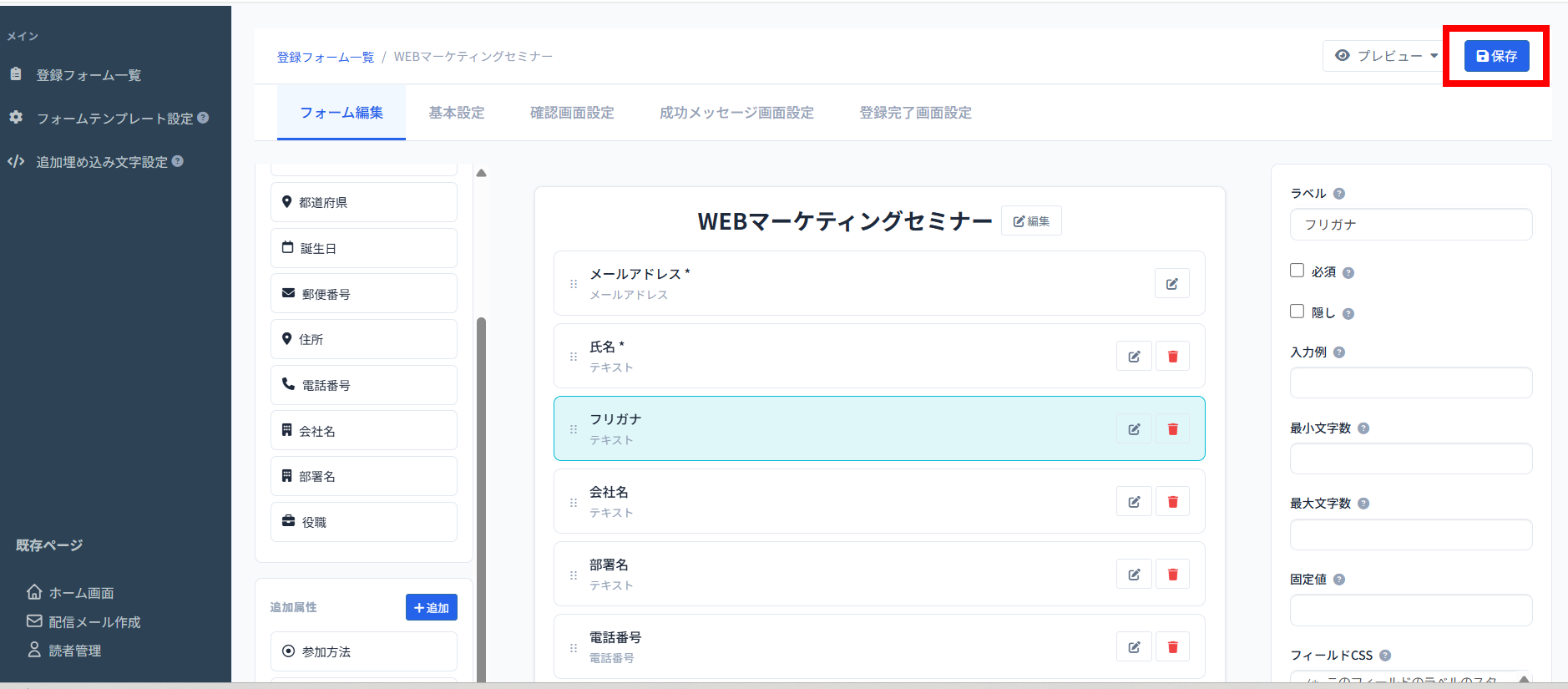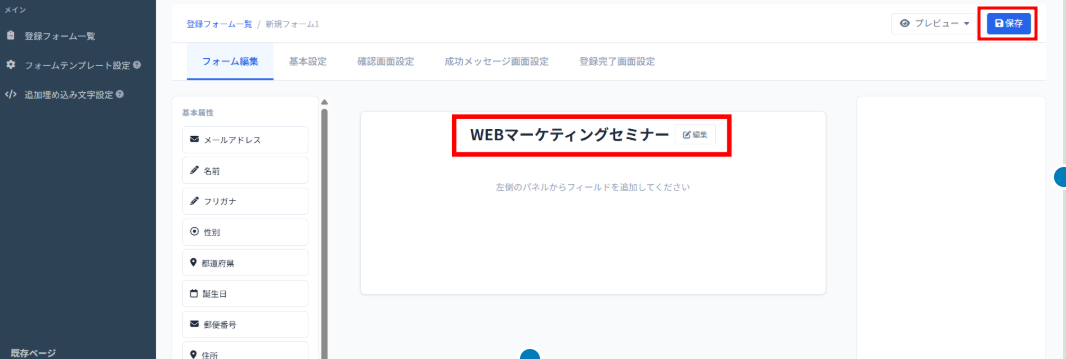 6、フォームが完成したら画面右上の「保存」ボタンを押します。