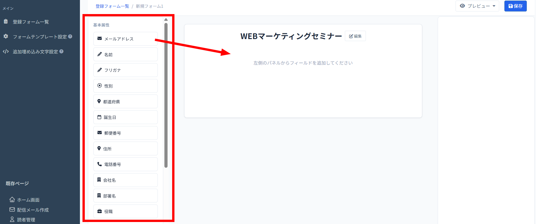 4、続いて、基本属性の中からフォームに必要な項目をドラッグ&ドロップします。