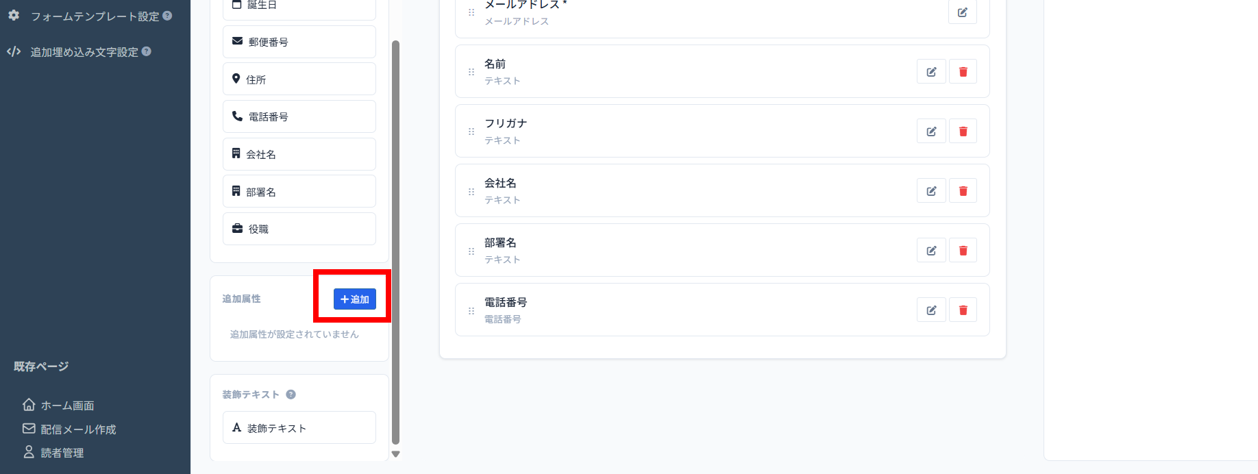基本属性以外の項目を追加したい場合は、追加属性の「+追加」ボタンより項目を作成します。