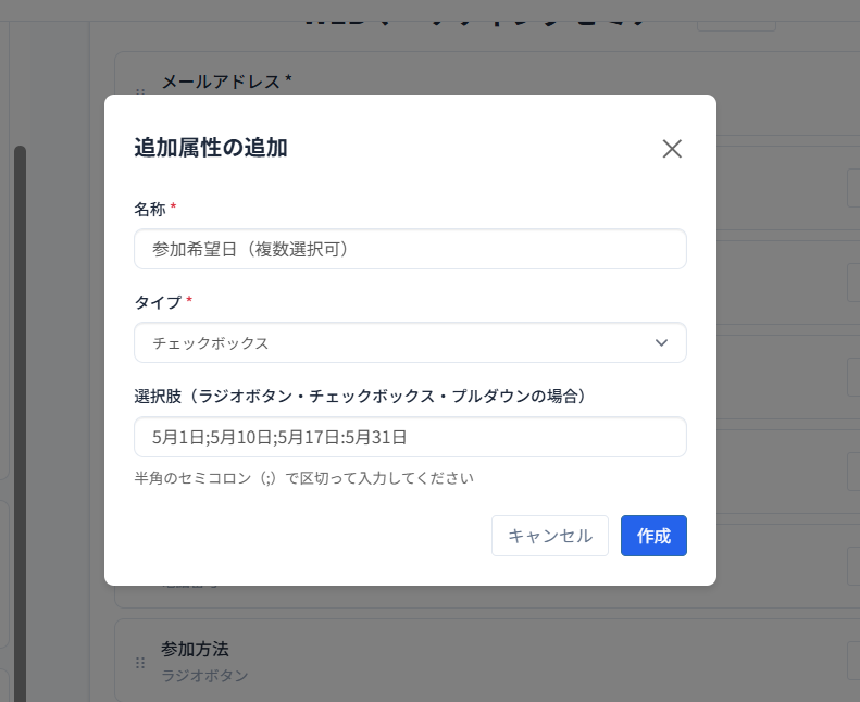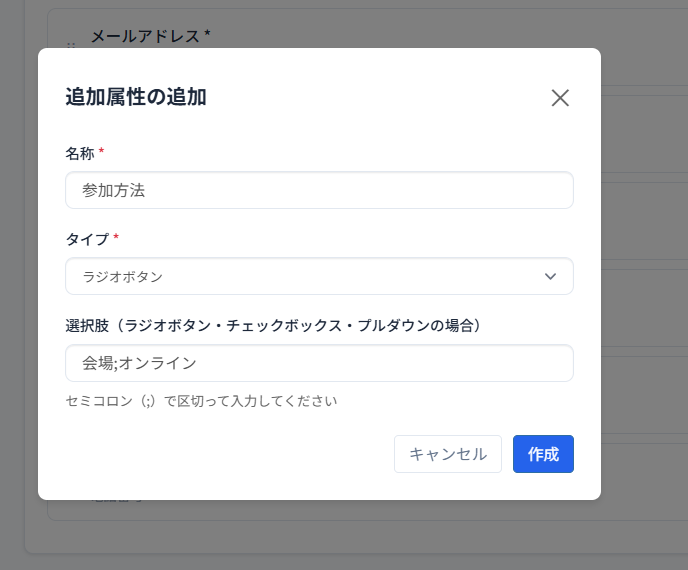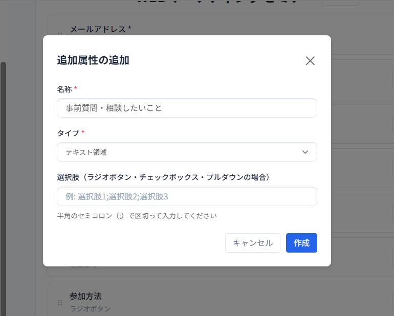 名称・タイプ・選択肢を入力し「作成」ボタンをクリックします。