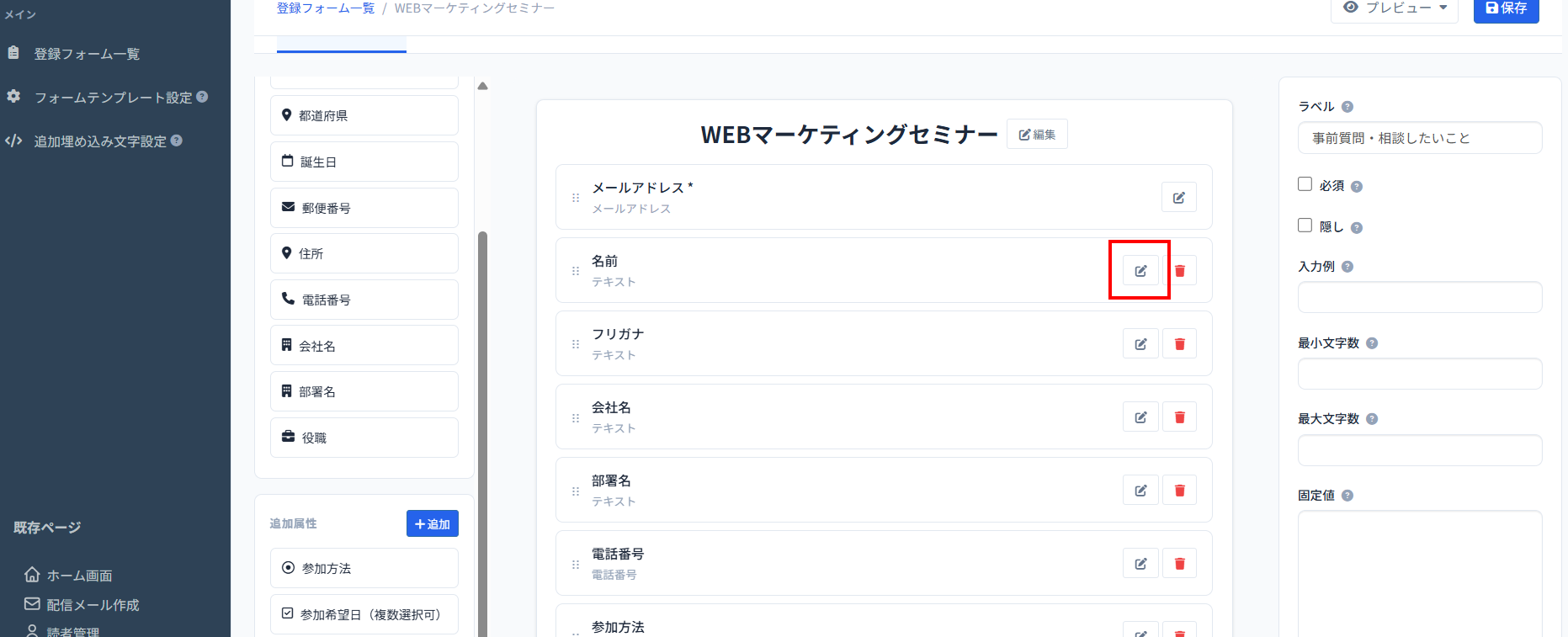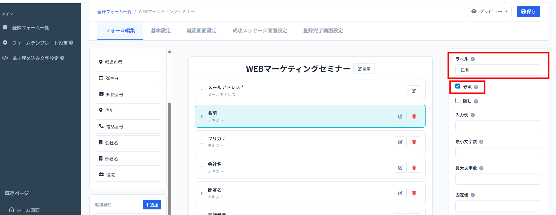 5、項目の名称を変更したい場合や必須入力・隠し入力(ユーザーに項目を見せないようにする)にしたい場合は、下記の操作で変更が可能です。