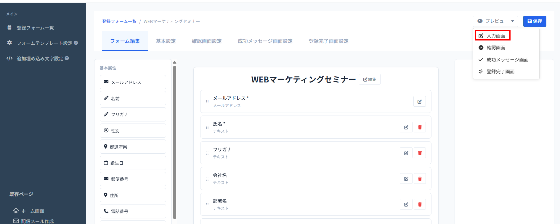 7、「プレビュー」>「入力画面」「確認画面」「成功メッセージ画面」「登録完了画面」で作成した登録フォームの確認ができます。