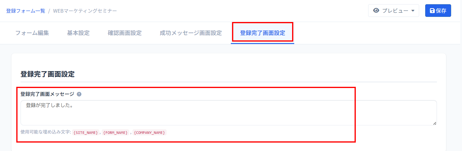 1、該当のフォーム>「登録完了画面設定」をクリックし、本文を編集します。