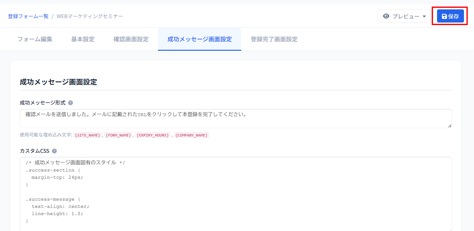 4、文字の太さや色を変える場合は「成功メッセージ画面設定」>「カスタムCSS」より設定ができます。