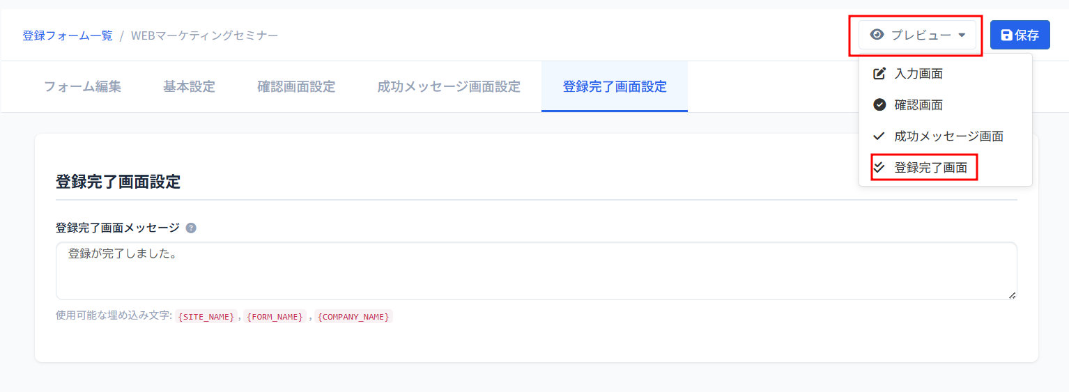 3、「プレビュー」>「登録完了画面」で確認ができます。